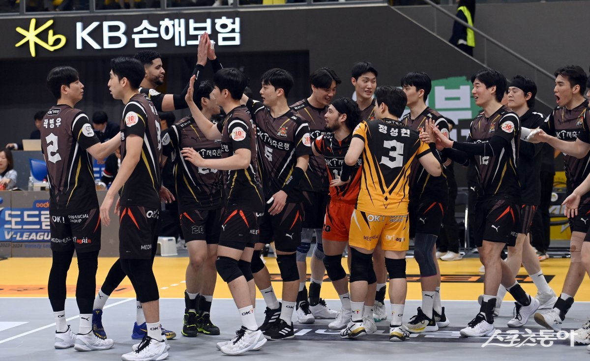 18일 의정부체육관에서 열린 ‘도드람 2023~2024 V-리그’ 남자부 KB손해보험과 OK금융그룹 경기에서 세트스코어 3-1 승리를 거둔 OK금융그룹 선수들이 기뻐하고 있다.