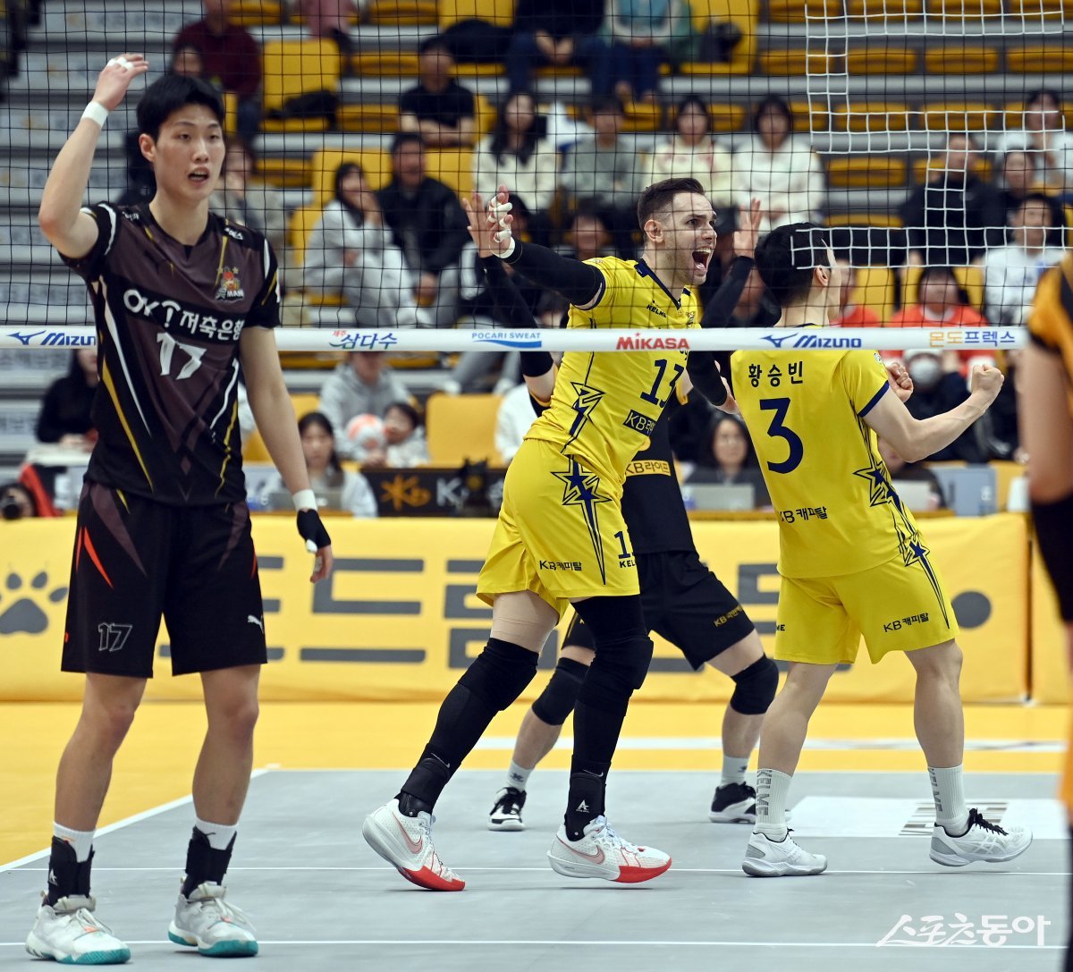 18일 의정부체육관에서 열린 ‘도드람 2023~2024 V-리그’ 남자부 KB손해보험과 OK금융그룹 경기에서 KB손해보험 비예나가 공격 득점에 성공한 후 기뻐하고 있다.