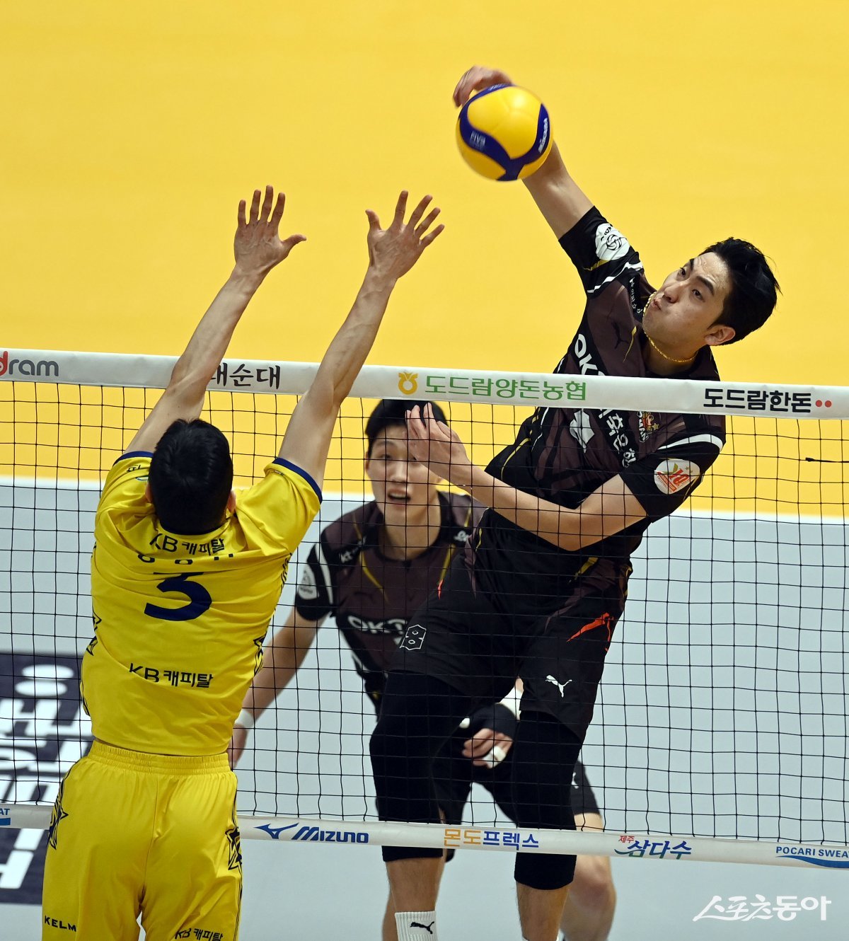 18일 의정부체육관에서 열린 ‘도드람 2023~2024 V-리그‘ 남자부 KB손해보험과 OK금융그룹 경기에서 OK금융그룹 차지환이 KB손해보험의 블로킹 사이로 스파이크를 날리고 있다.