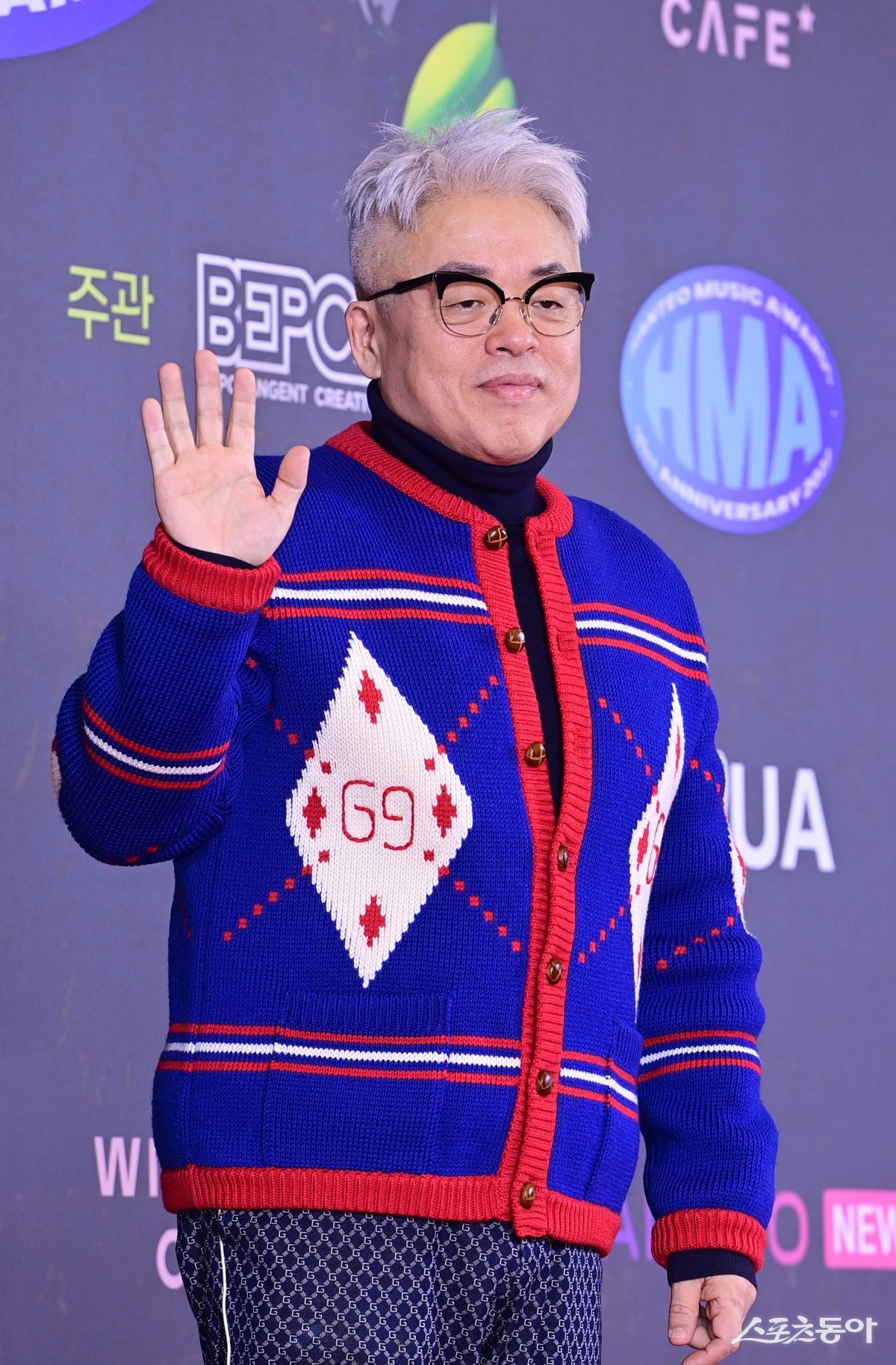 작곡가 김형석이 18일 서울 중구 을지로 동대문디자인플라자에서 열린 ‘31주년 한터뮤직어워즈 2023’ 레드카펫에서 포즈를 취하고 있다.