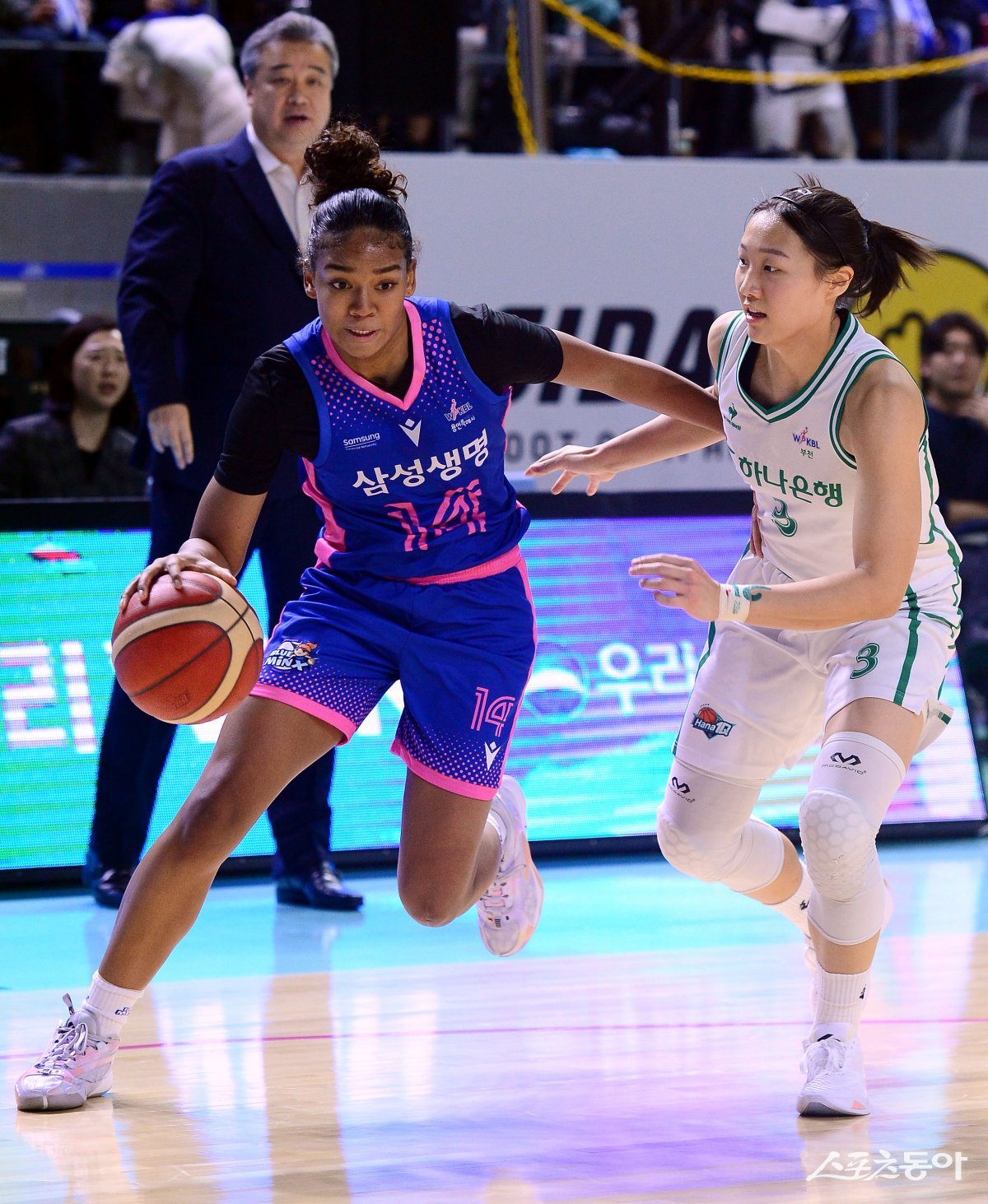 18일 경기도 용인실내체육관에서 열린 ‘우리은행 우리 WON 2023-2024 여자프로농구’ 용인 삼성생명과 부천 하나원큐의 경기에서 삼성생명 키아나가 하나원큐 정예림의 수비를 제치며 돌파하고 있다.