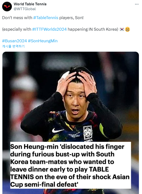 국제탁구연맹 자회사인 월드테이블테니스(WTT)는 지난 15일 공식 SNS에 "손(흥민), 탁구선수들을 건드리지 말라"고 적었다.