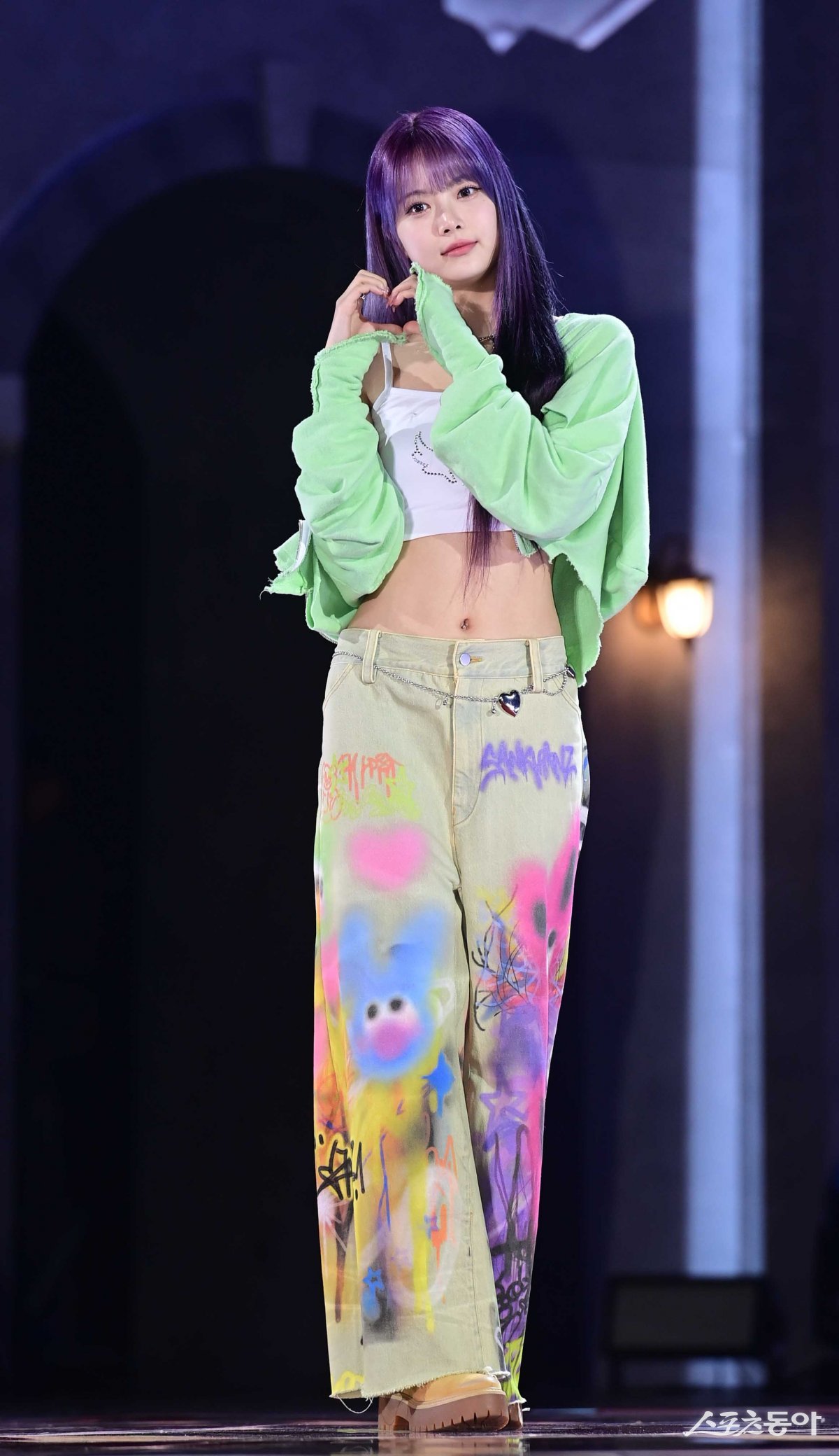 그룹 르세라핌 홍은채가 19일 서울 성북구 고려대학교 화정체육관에서 열린 미니앨범 3집 ‘EASY’ 발매 기념 쇼케이스에서 포즈를 취하고 있다.