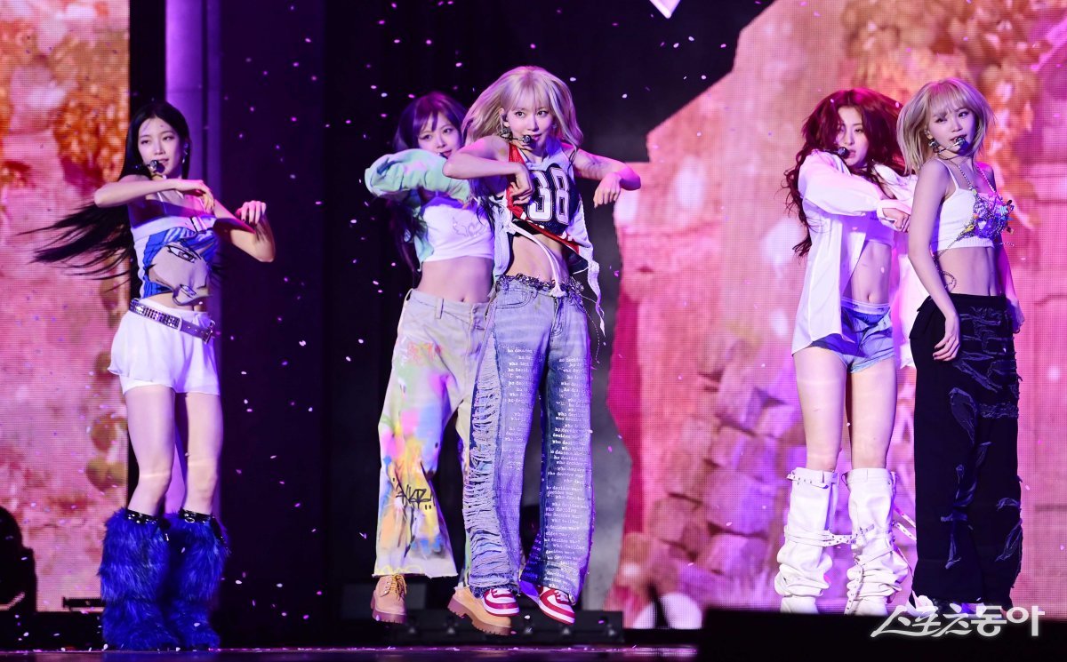 그룹 르세라핌이 19일 서울 성북구 고려대학교 화정체육관에서 열린 미니앨범 3집 ‘EASY’ 발매 기념 쇼케이스에서 동명의 타이틀곡 무대를 펼치고 있다.