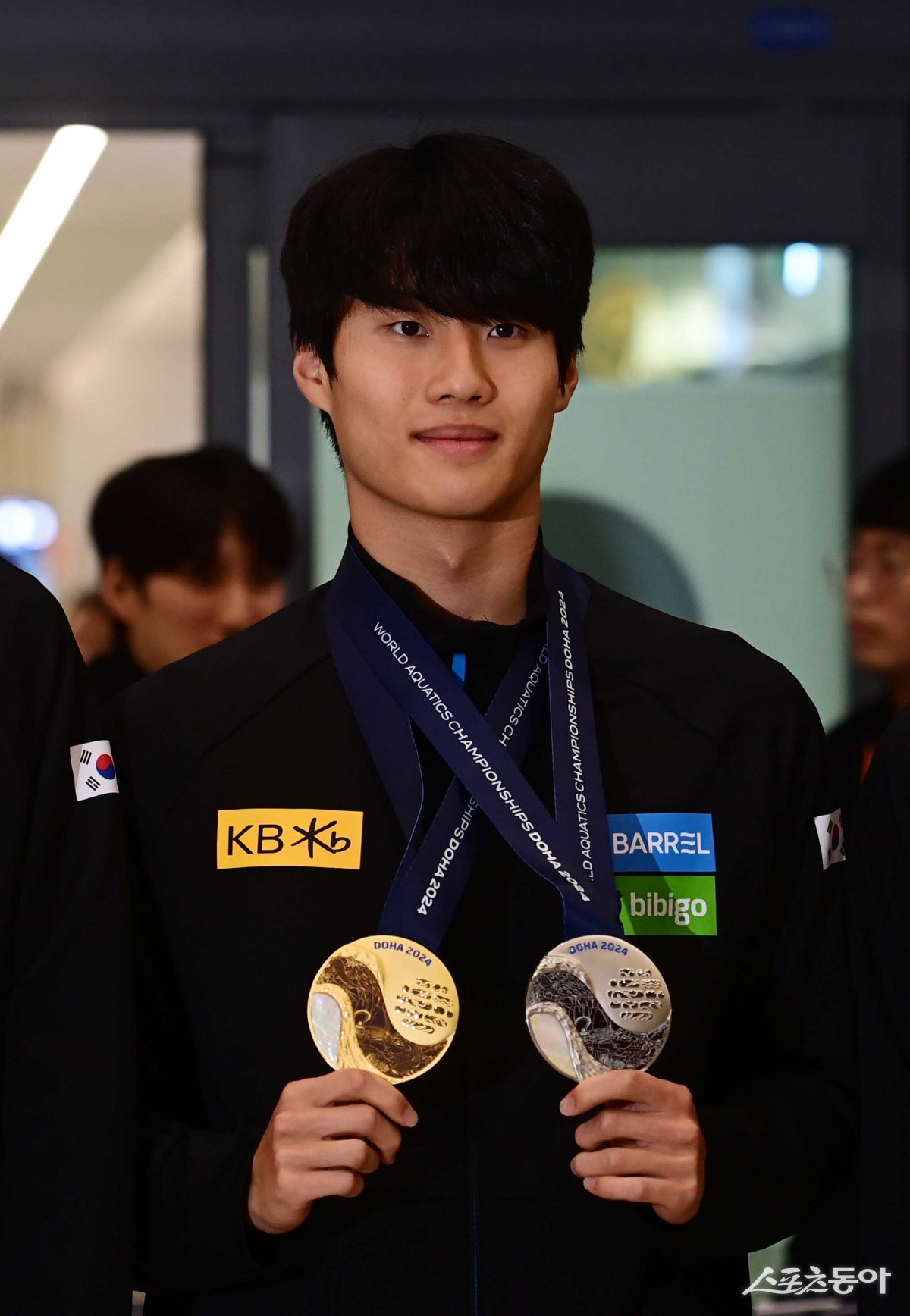 19일 카타르 도하 세계수영선수권 대회에서 세계 8위를 기록한 수영국가대표팀이 인천공항을 통해 귀국하고 있다. 황선우가 기념 촬영을 하고 있다.