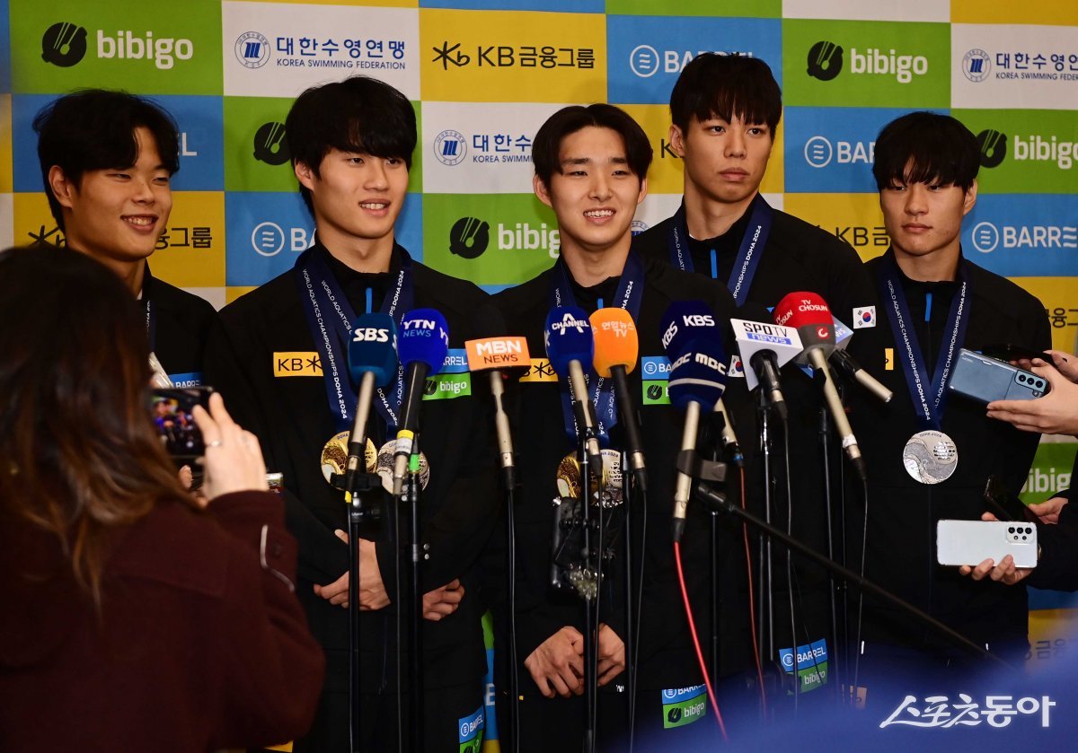19일 카타르 도하 세계수영선수권 대회에서 세계 8위를 기록한 수영국가대표팀이 인천공항을 통해 귀국하고 있다. 이호준, 황선우, 김우민, 양재훈, 이유연이 인터뷰를 하고 있다.