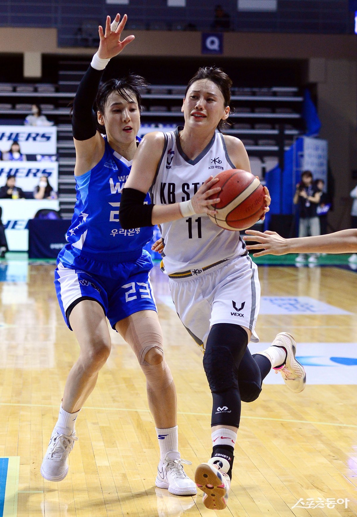 19일 충남 아산이순신체육관에서 열린 ‘우리은행 우리 WON 2023-2024 여자프로농구’ 아산 우리은행과 청주 KB의 경기에서 KB 강이슬이 우리은행 김단비의 수비를 피해 돌파를 시도하고 있다.