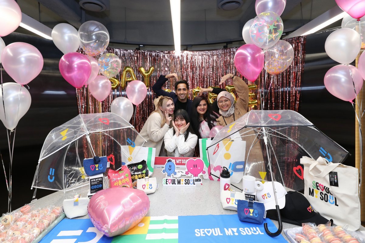 2024 글로벌서울메이트 발대식에 참석한 외국인 인플루언서들이 포토존에서 서울 굿즈를 체험하고 있다. 사진제공|서울관광재단