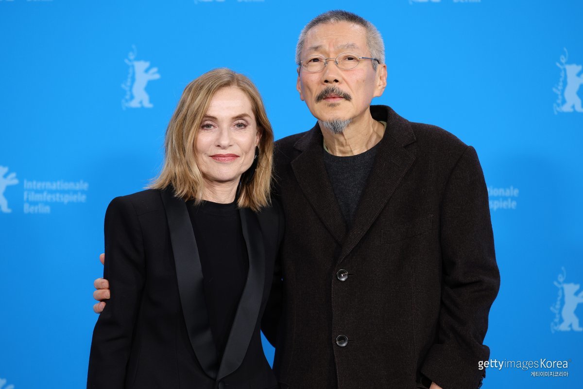 홍상수 감독과 배우 이자벨 위페르가 19일(현지시간) 독일 베를린에서 열린 제74회 베를린 영화제 초청작인 영화 '여행자의 필요' 포토 콜 행사서 포즈를 취하고 있다.
