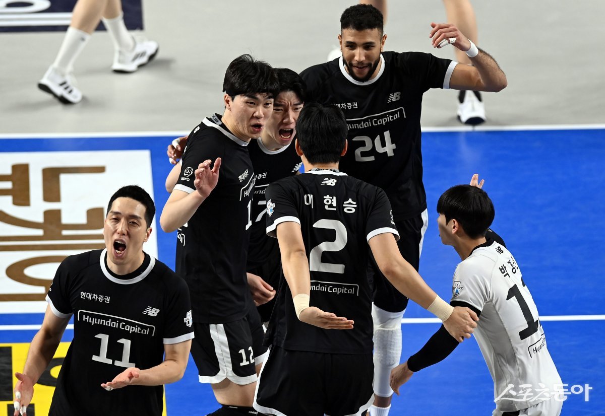 20일 충남 천안유관순체육관에서 ‘2023-2024 도드람 V리그’ 천안 현대캐피탈과 대전 삼성화재의 남자부 경기가 열렸다. 현대캐피탈 선수들이 득점 후 환호하고 있다.