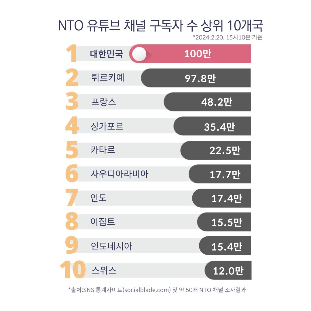 전 세계 국가관광기구(NTO) 채널 중 구독자 100만 돌파 최초