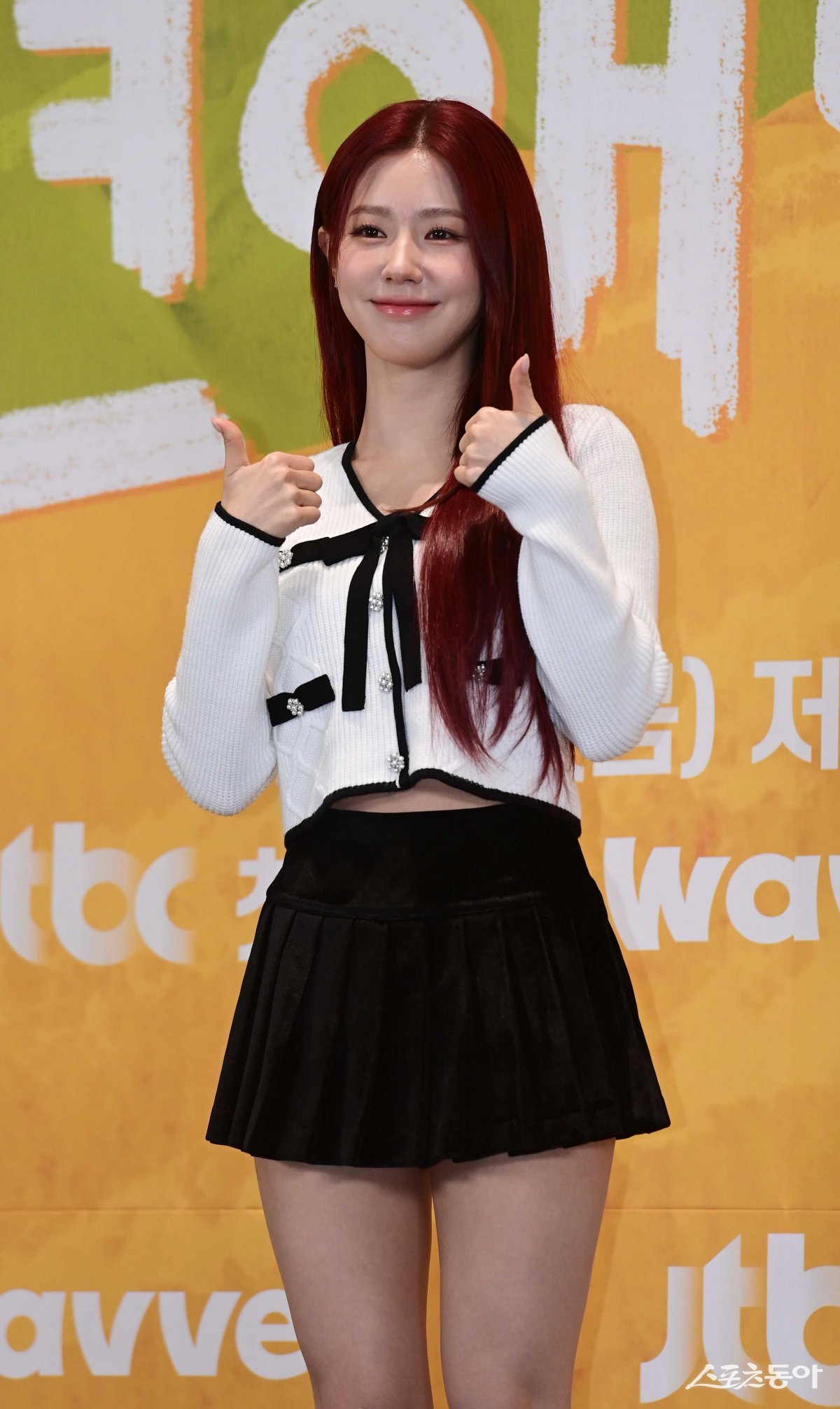 (여자)아이들 미연이 21일 경기도 고양시 일산동구 소노캄고양웨스트타워에서 열린 JTBC X 웨이브 새 예능프로그램 ‘연애남매’ 제작발표회에서 포즈를 취하고 있다.