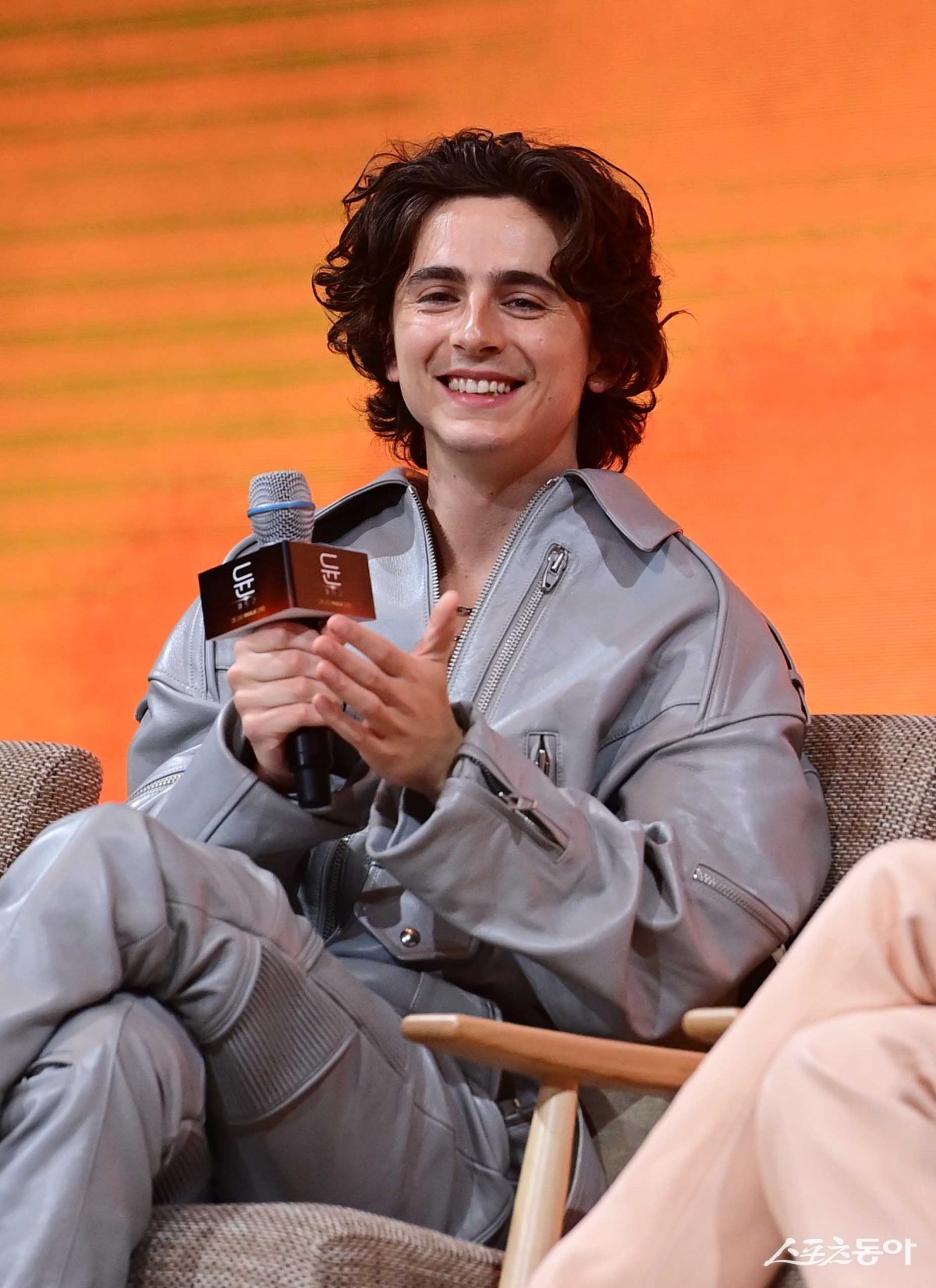 배우 티모시 샬라메가 21일 서울 영등포구 여의도동 콘래드서울에서 열린 영화 ‘듄: 파트2’ 내한 기자간담회에서 동료의 답변에 웃고 있다.