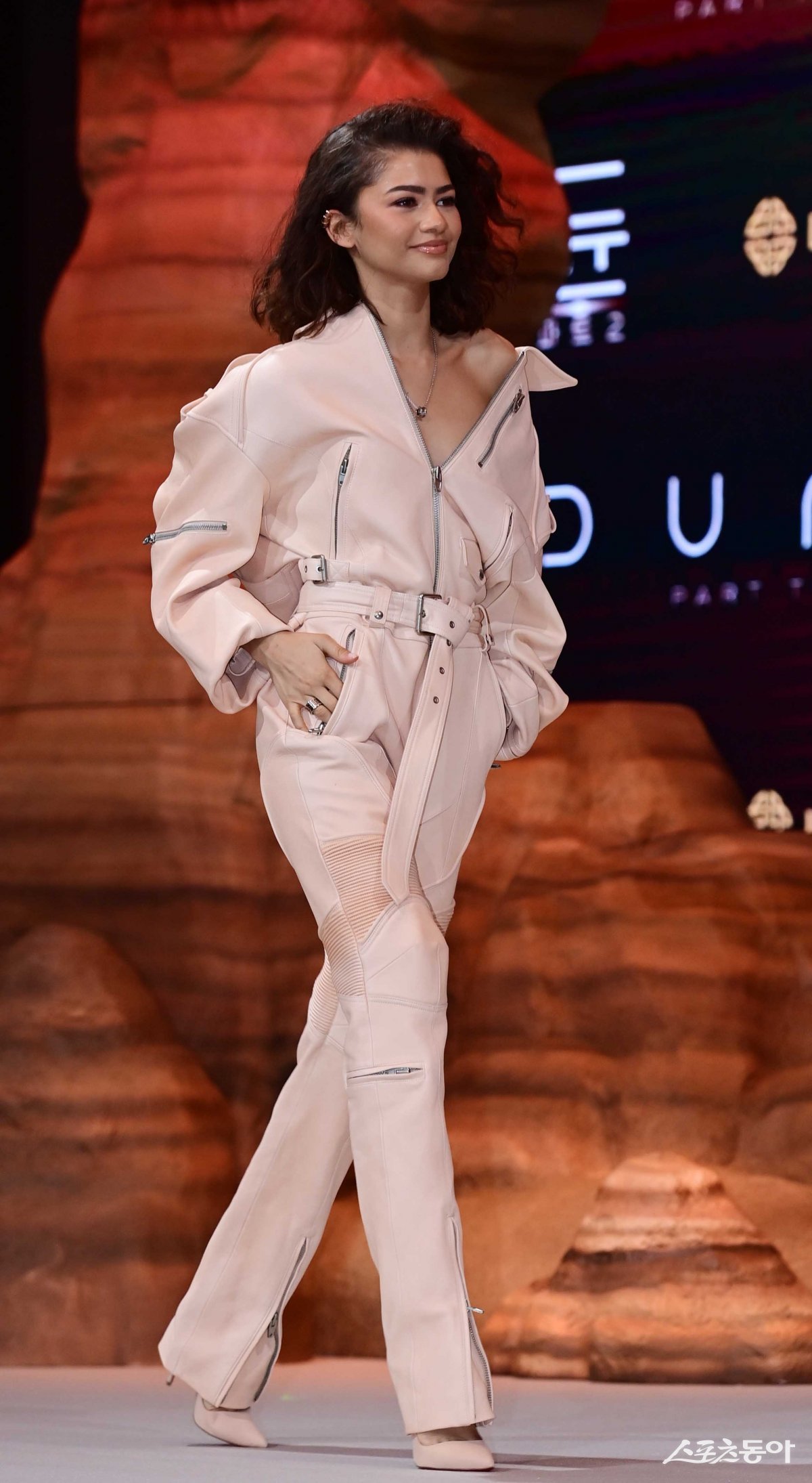 배우 젠데이아가 21일 서울 영등포구 여의도동 콘래드서울에서 열린 영화 ‘듄: 파트2’ 내한 기자간담회 무대에 오르고 있다.