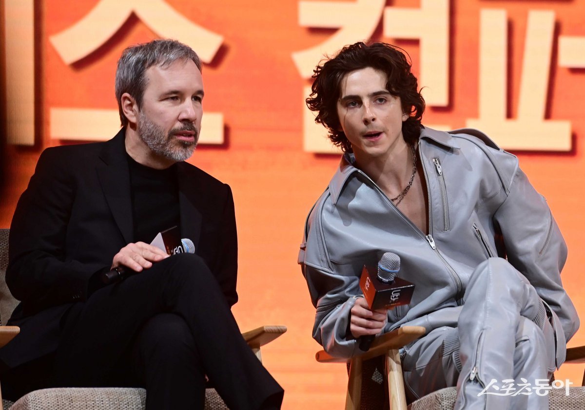 드니 빌뇌르 감독과 배우 티모시 샬라메가 21일 서울 영등포구 여의도동 콘래드서울에서 열린 영화 ‘듄: 파트2’ 내한 기자간담회에서 이야기를 하고 있다.