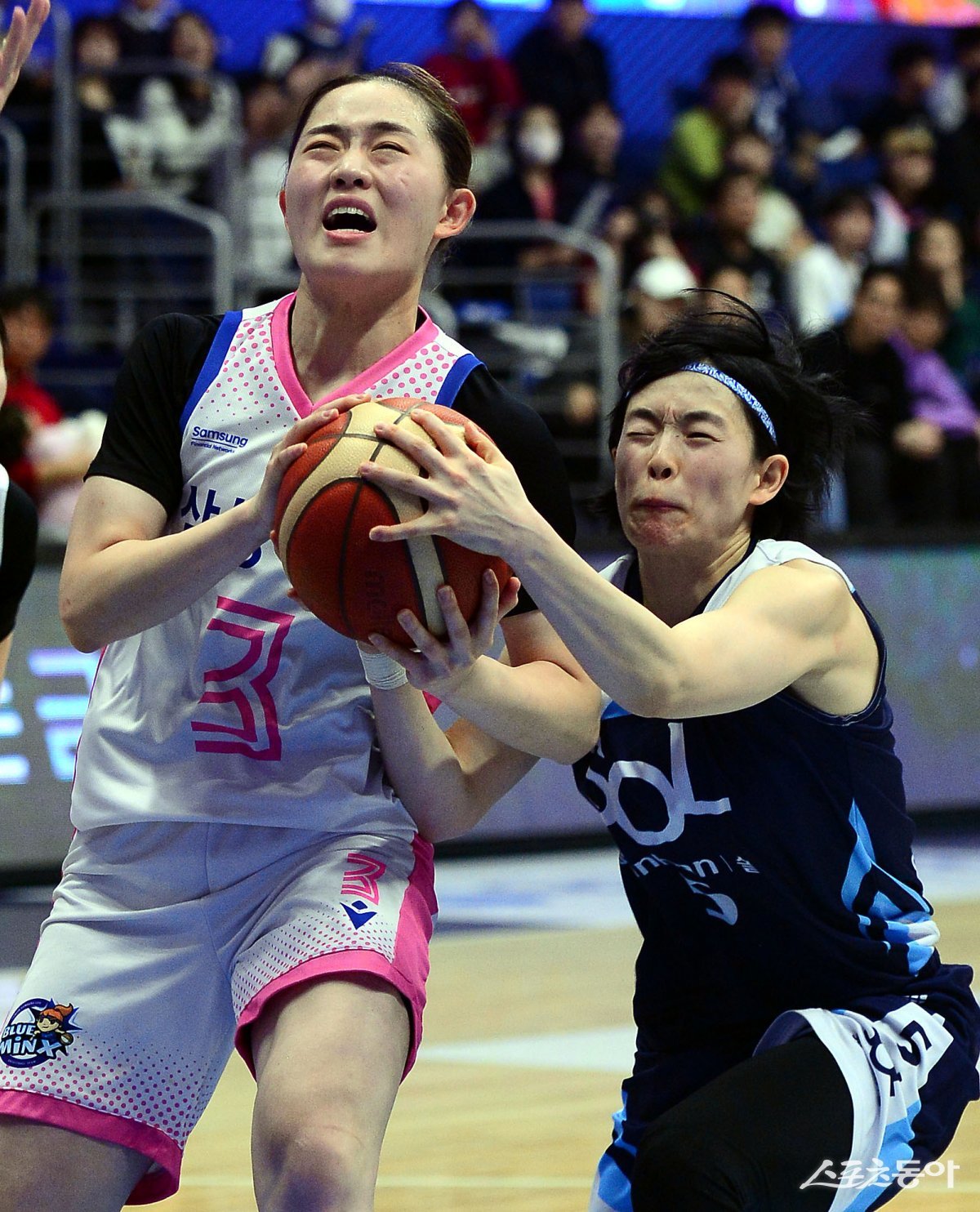 21일 인천 도원체육관에서 열린 ‘우리은행 우리 WON 2023-2024 여자프로농구’ 인천 신한은행과 용인 삼성생명의 경기에서 삼성생명 조수아와 신한은행 강계리가 볼 다툼을 벌이고 있다.