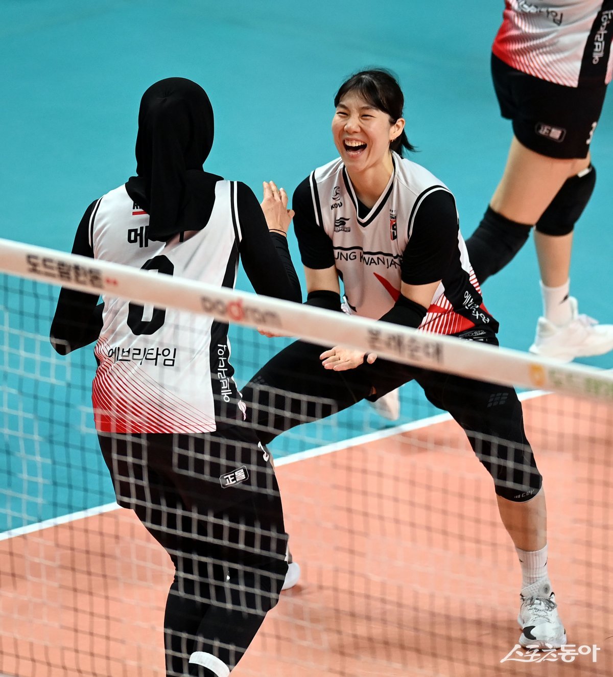 21일 서울 장충체육관에서 열린 ‘도드람 2023~2024 V-리그’ 여자부 GS칼텍스와 정관장 경기에서 정관장 이소영이 팀 득점에 기뻐하고 있다. 장충 | 김종원 기자 won@donga.com