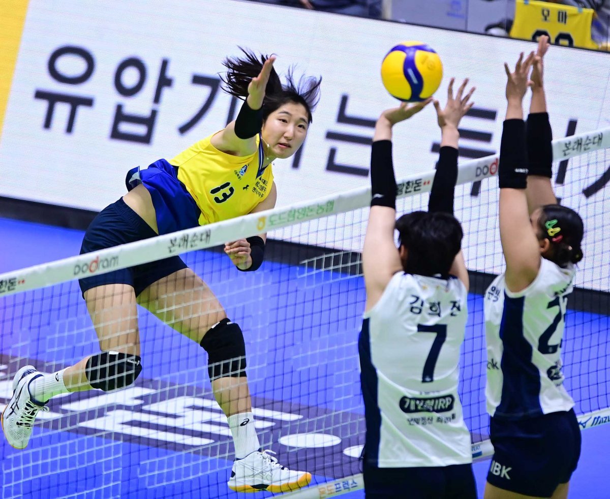 22일 경기도 수원체육관에서 열린 ‘도드람 2023-2024 V리그’ 여자부 수원 현대건설과 화성 IBK기업은행의 경기에서 현대건설 정지윤이 IBK기업은행 블로커 앞에서 스파이크를 하고 있다.