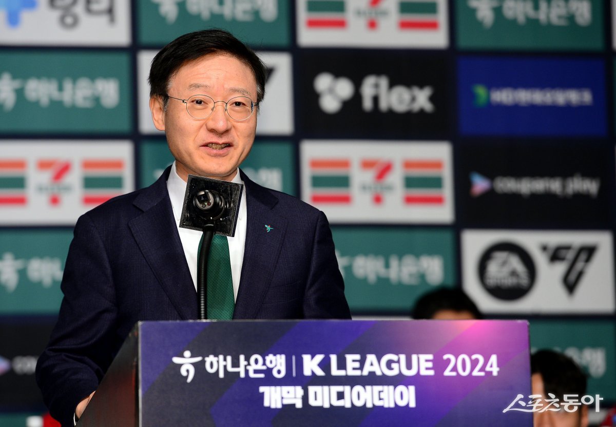 26일 서울 중구 더플라자 호텔에서 열린 ‘하나은행 K리그1 2024 미디어데이’에 참석한 이승열 하나은행장이 인사말을 밝히고 있다.