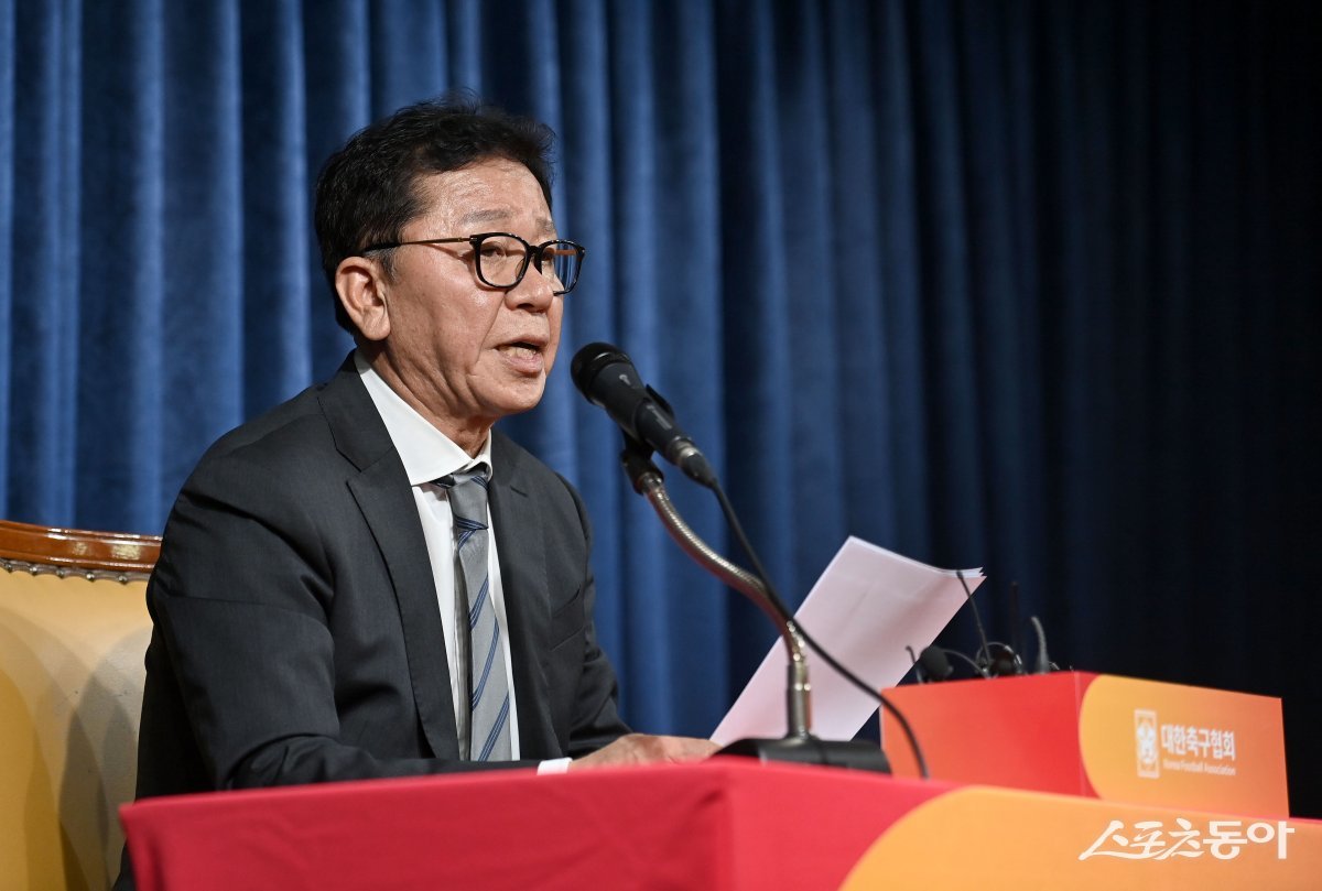 정해성 전력강화위원장이 27일 서울 종로구 신문로 축구회관에서 3차 국가대표 전력강화 위원회 회의 결과를 브리핑을 하고 있다.