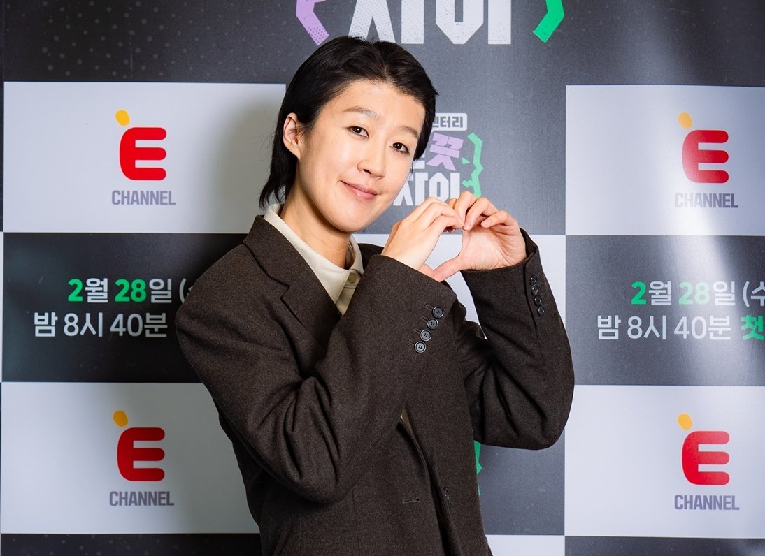방송인 홍진경이 28일 온라인으로 열린 E채널 ‘한 끗 차이: 사이코멘터리’ 제작발표회 무대에서 손으로 하트 모양을 만들며 포즈를 취하고 있다. 사진제공|E채널