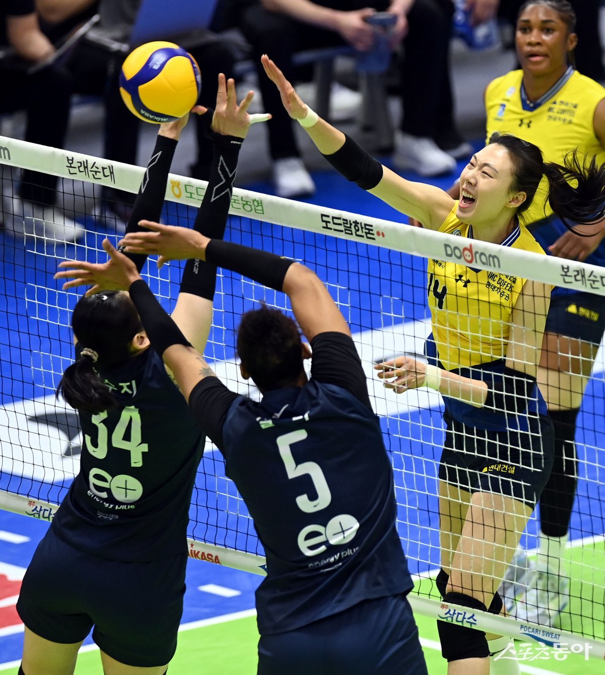 28일 경기도 수원체육관에서 ‘2023-2024 도드람 V리그’ 수원 현대건설과 서울 GS칼텍스의 여자부 경기가 열렸다. 현대건설 양효진이 GS칼텍스 블로커를 피해 공격을 펼치고 있다.