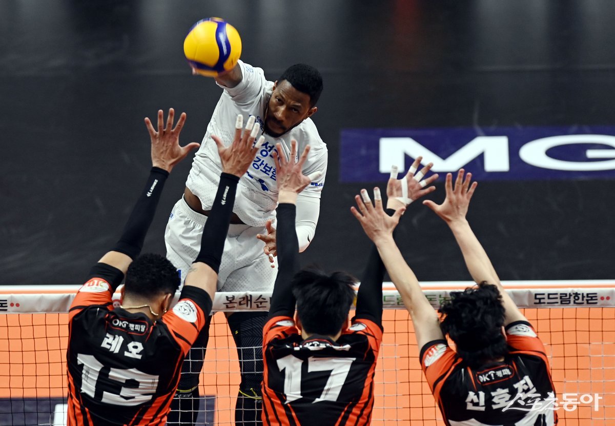 3일 경기도 안산상록수체육관에서 ‘2023-2024 도드람 V리그’ 안산 OK금융그룹과 대전 삼성화재의 남자부 경기가 열렸다. 삼성화재 요스바니가 OK금융그룹 블로커를 피해 스파이크를 날리고 있다.