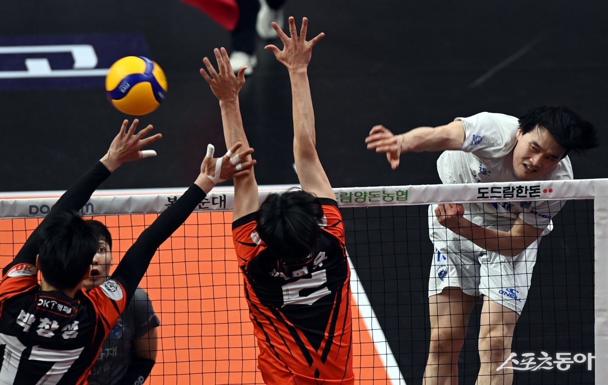 3일 경기도 안산상록수체육관에서 ‘2023-2024 도드람 V리그’ 안산 OK금융그룹과 대전 삼성화재의 남자부 경기가 열렸다. 삼성화재 김정호가 OK금융그룹 블로커를 피해 스파이크를 날리고 있다.