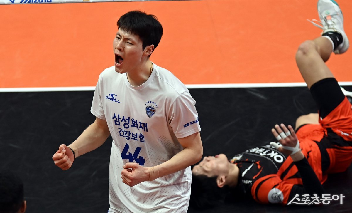 3일 경기도 안산상록수체육관에서 ‘2023-2024 도드람 V리그’ 안산 OK금융그룹과 대전 삼성화재의 남자부 경기가 열렸다. 삼성화재 에디가 득점을 올린 후 환호하고 있다.
