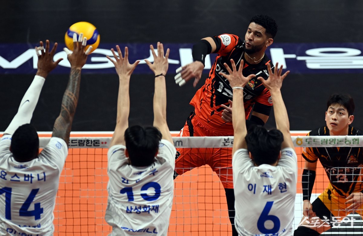 3일 경기도 안산상록수체육관에서 ‘2023-2024 도드람 V리그’ 안산 OK금융그룹과 대전 삼성화재의 남자부 경기가 열렸다. OK금융그룹 레오가 삼성화재 블로커를 피해 스파이크를 날리고 있다.