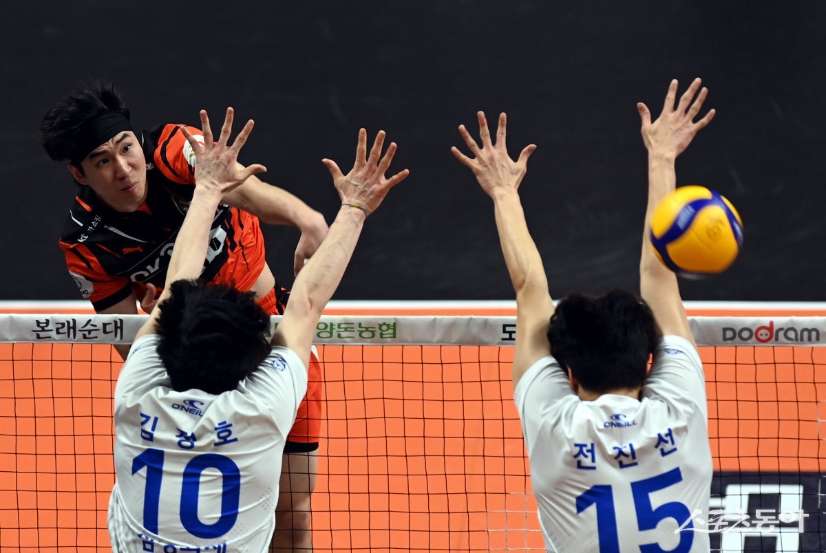 3일 경기도 안산상록수체육관에서 ‘2023-2024 도드람 V리그’ 안산 OK금융그룹과 대전 삼성화재의 남자부 경기가 열렸다. OK금융그룹 신호진이 삼성화재 블로커를 피해 스파이크를 날리고 있다.