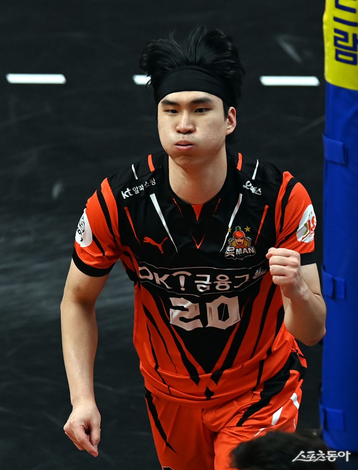 3일 경기도 안산상록수체육관에서 ‘2023-2024 도드람 V리그’ 안산 OK금융그룹과 대전 삼성화재의 남자부 경기가 열렸다. OK금융그룹 신호진이 득점을 올린 후 환호하고 있다.