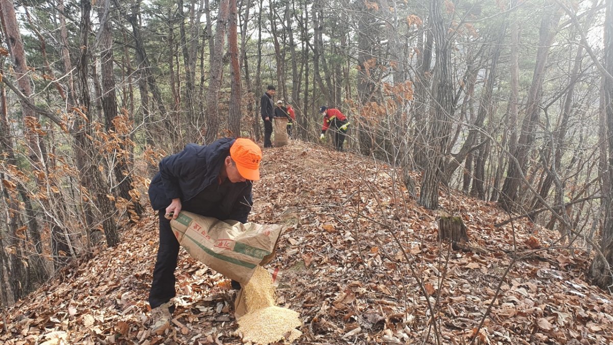 행사는 야생동물의 먹이 부족 현상을 해소하기 위해 물야면 박달령 주실령, 봉성면 다덕재, 소천면 넛재, 재산면 고티재 일원에 옥수수사료 4,000kg을 인적이 드문 이동통로 곳곳에 살포하는 것으로 진행됐다.
