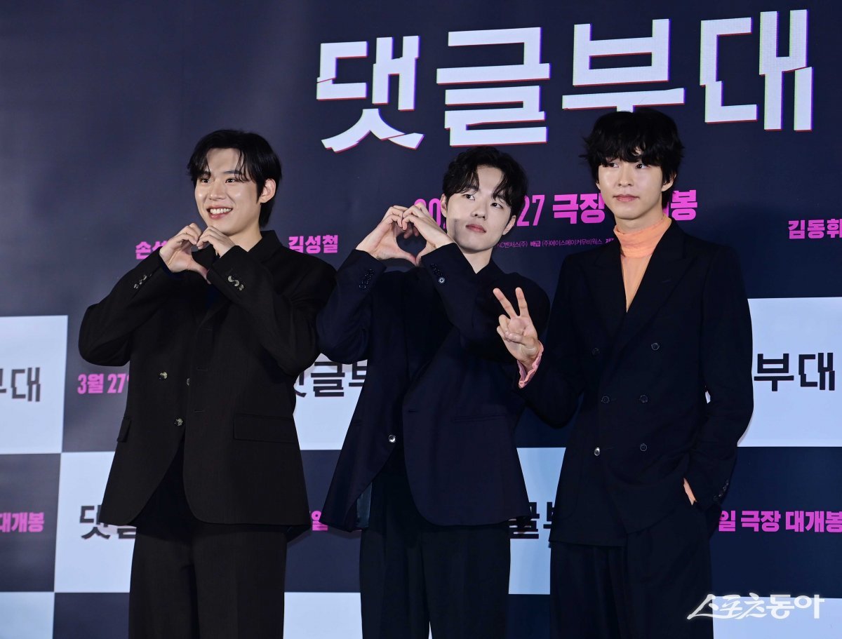 배우 김성철, 김동휘, 홍경이 4일 서울 광진구 자양동 롯데시네마 건대입구점에서 열린 영화 ‘댓글부대’ 제작보고회에서 포즈를 취하고 있다.