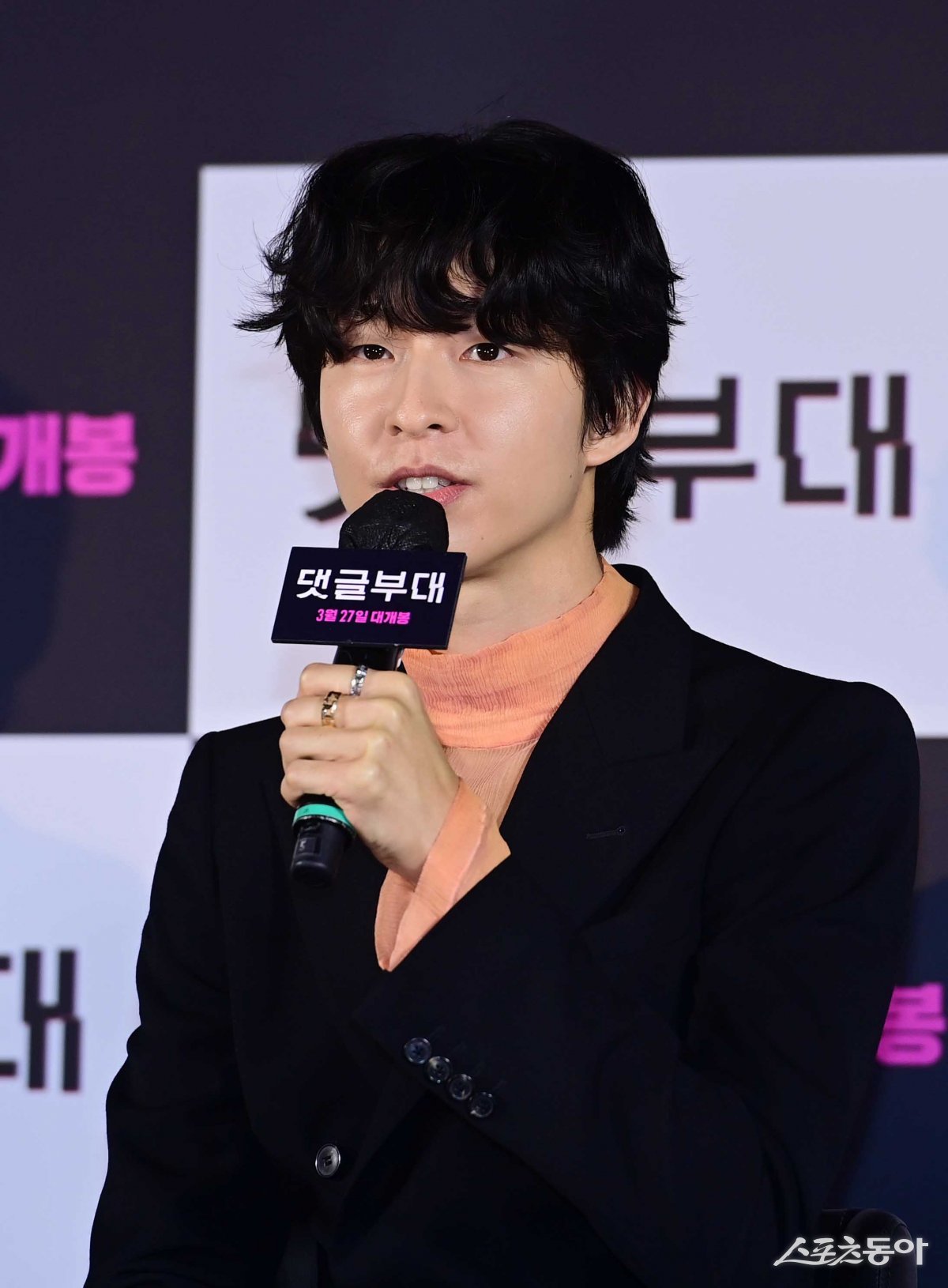 배우 홍경이 4일 서울 광진구 자양동 롯데시네마 건대입구점에서 열린 영화 ‘댓글부대’ 제작보고회에서 인사말을 하고 있다.