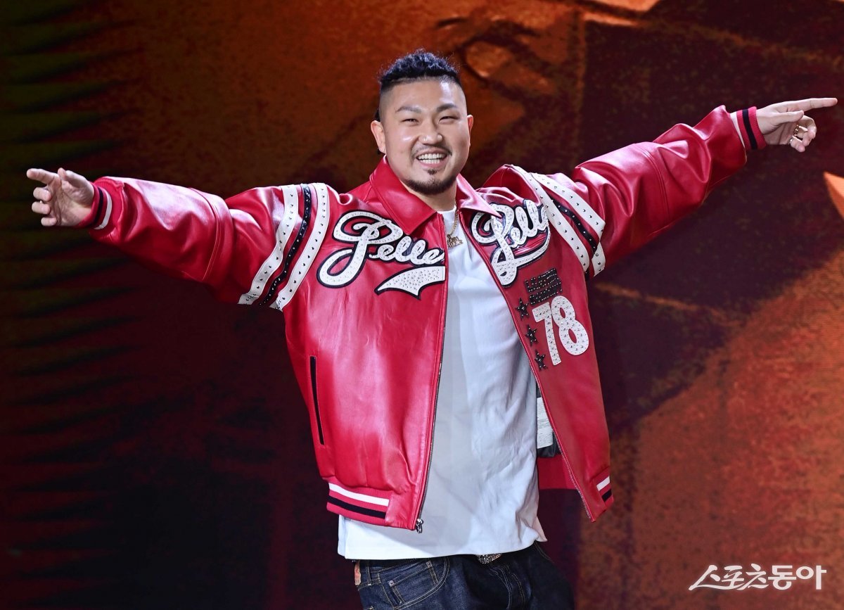 래퍼 던밀스가 4일 서울 강남구 청담동 일지아트홀에서 열린 유튜브 힙합 서바이벌 ‘2024 토너먼트 벌스 랩 배틀 랩컵’ 제작발표회에서 포즈를 취하고 있다.