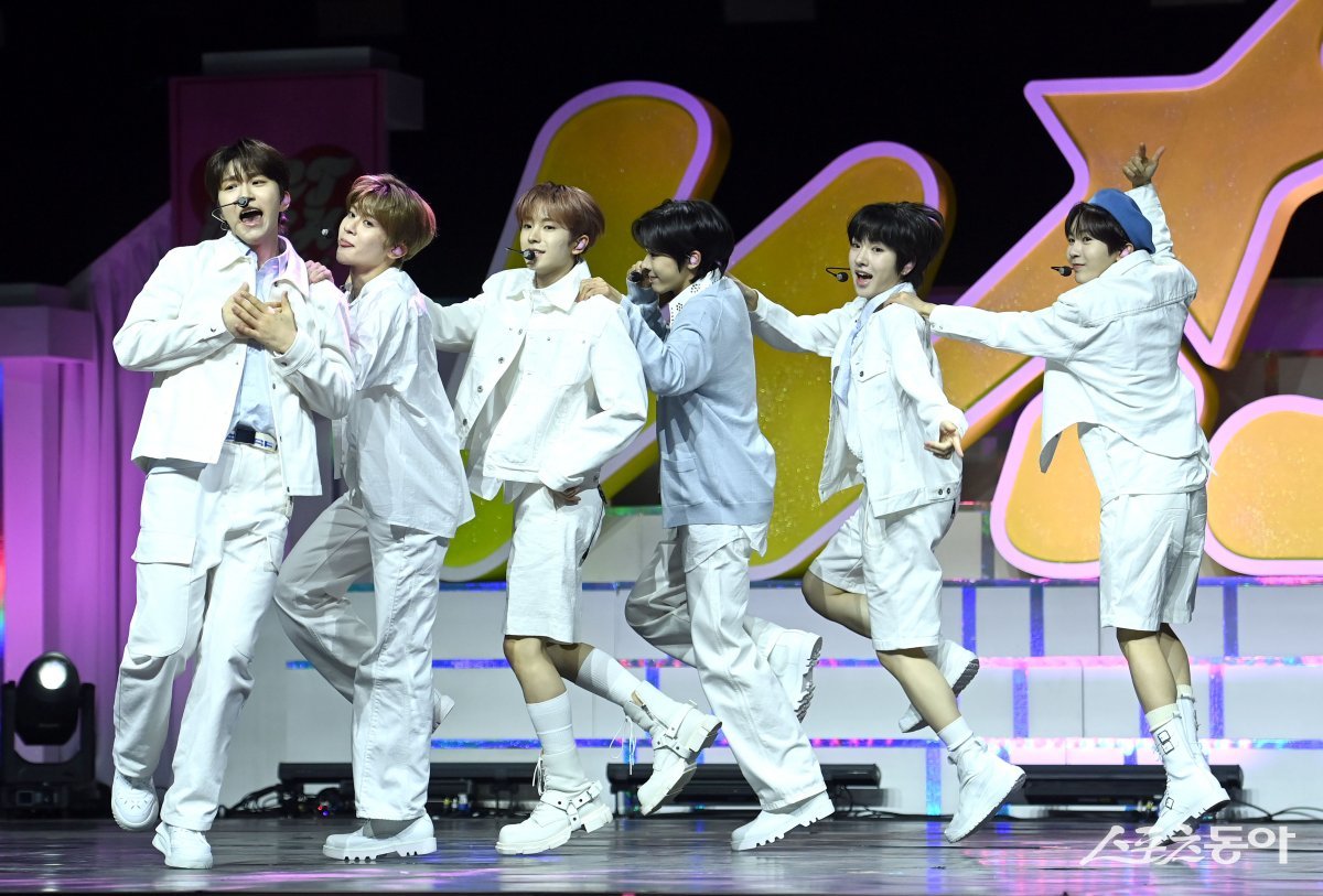 그룹 ‘엔시티 위시(NCT WISH) NCT WISH)’가 4일 서울 용산구 블루스퀘어 마스터카드홀에서 열린 데뷔 싱글 ‘WISH’ 발매 쇼케이스에서 화려한 무대를 펼치고 있다.