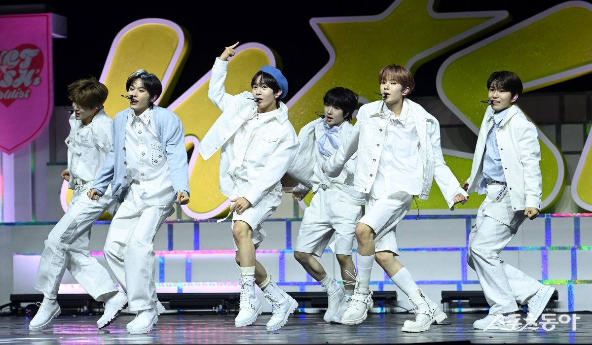 그룹 ‘엔시티 위시(NCT WISH) NCT WISH)’가 4일 서울 용산구 블루스퀘어 마스터카드홀에서 열린 데뷔 싱글 ‘WISH’ 발매 쇼케이스에서 화려한 무대를 펼치고 있다.