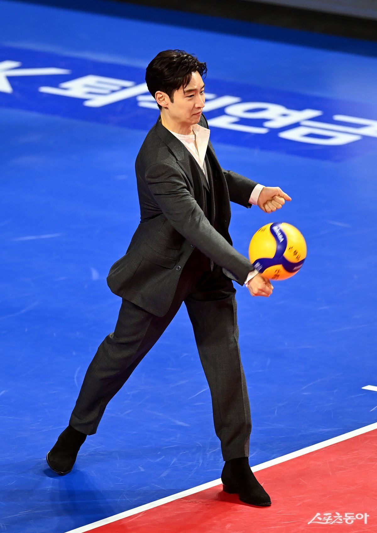 5일 화성종합경기타운 실내체육관에서 열린 ‘도드람 2023~2024 V리그’ 여자부 IBK기업은행과 흥국생명 경기 전 배우 이제훈이 시구를 하고 있다.
