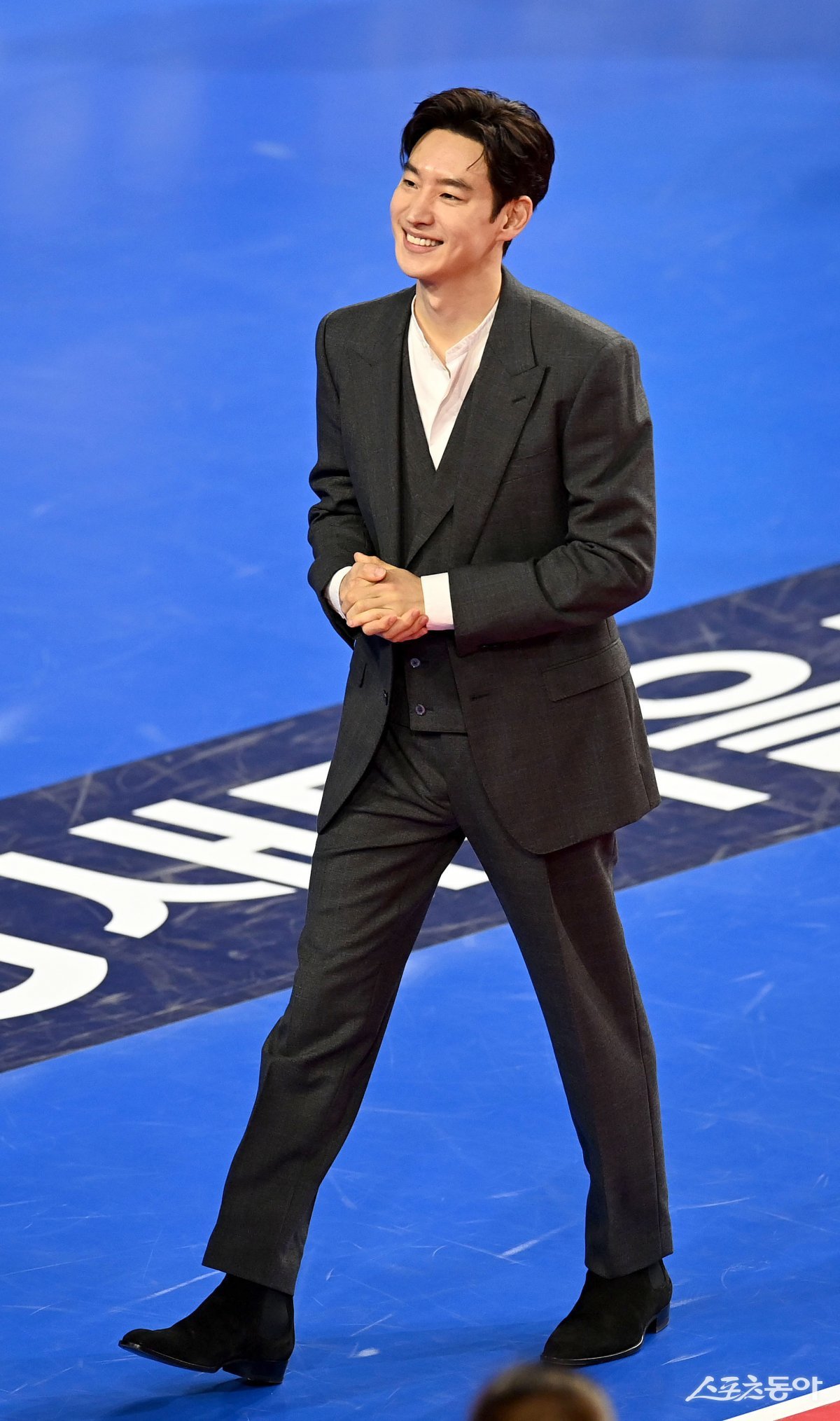 5일 화성종합경기타운 실내체육관에서 열린 ‘도드람 2023~2024 V리그’ 여자부 IBK기업은행과 흥국생명 경기 전 배우 이제훈이 시구를 마친 후 웃고 있다.