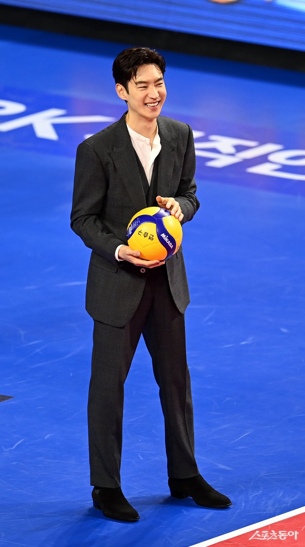 5일 화성종합경기타운 실내체육관에서 열린 ‘도드람 2023~2024 V리그’ 여자부 IBK기업은행과 흥국생명 경기 전 배우 이제훈이 시구를 하고 있다.