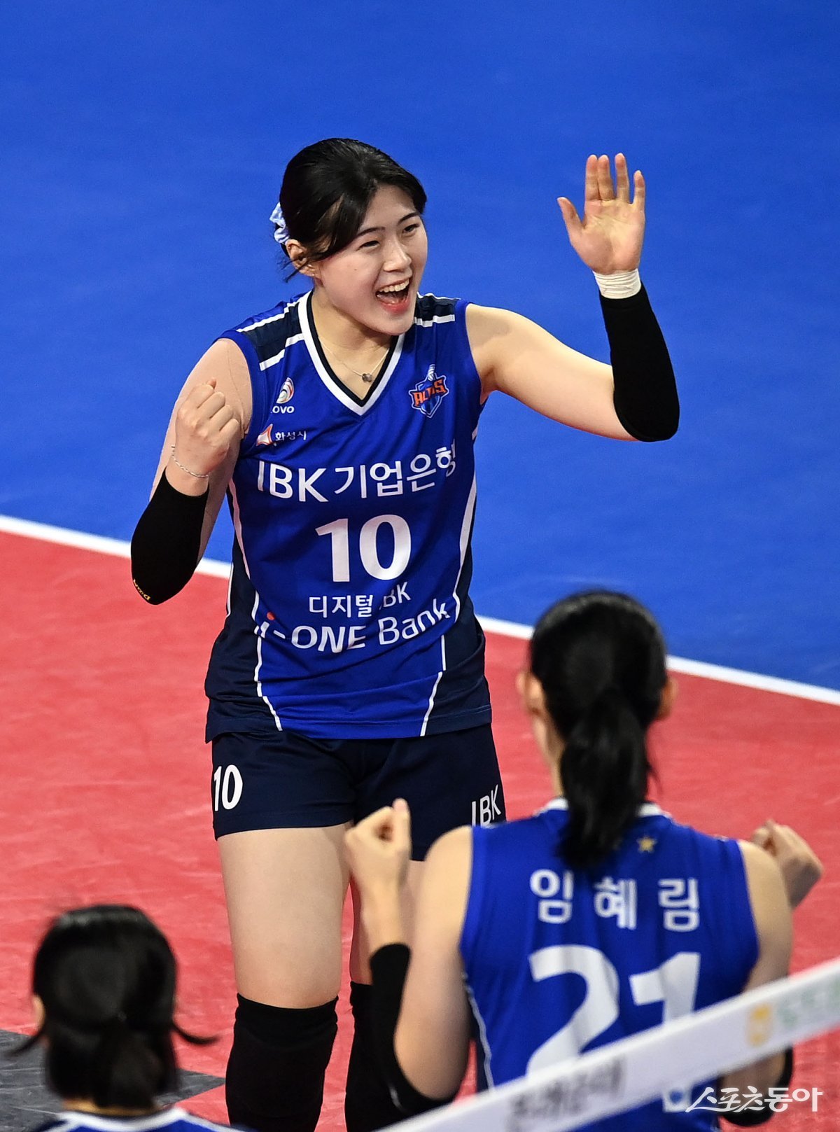 5일 화성종합경기타운 실내체육관에서 열린 ‘도드람 2023~2024 V리그’ 여자부 IBK기업은행과 흥국생명 경기에서 IBK기업은행 구혜인이 서브 득점에 성공한 후 기뻐하고 있다.