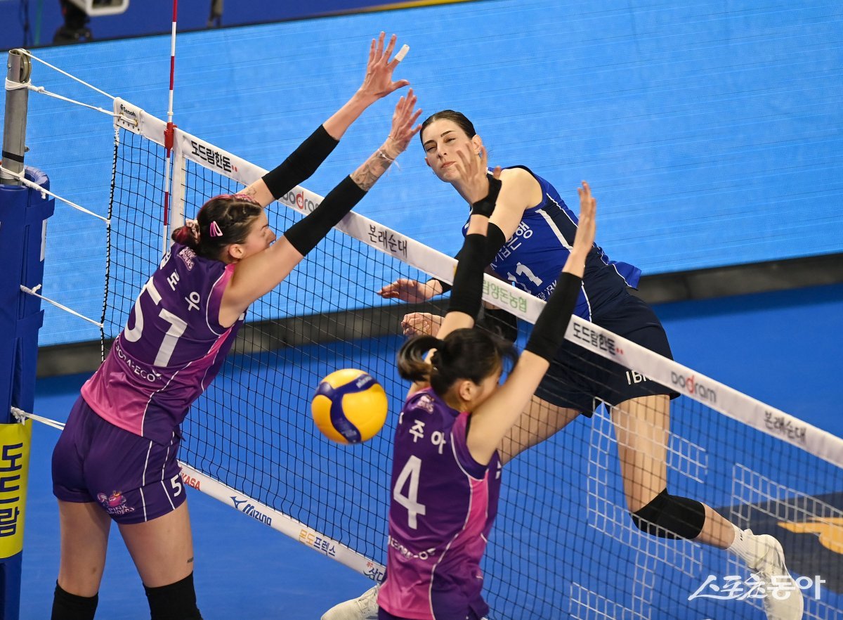 5일 화성종합경기타운 실내체육관에서 열린 ‘도드람 2023~2024 V리그’ 여자부 IBK기업은행과 흥국생명 경기에서 IBK기업은행 아베크롬비가 흥국생명의 블로킹 사이로 스파이크 공격을 하고 있다.