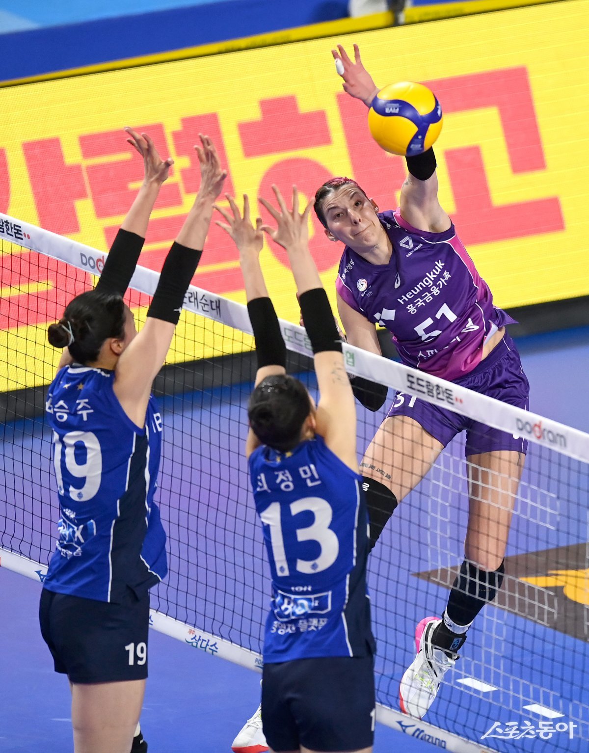 5일 화성종합경기타운 실내체육관에서 열린 ‘도드람 2023~2024 V리그’ 여자부 IBK기업은행과 흥국생명 경기에서 흥국생명 윌로우가 IBK기업은행의 블로킹 사이로 스파이크 공격을 하고 있다.