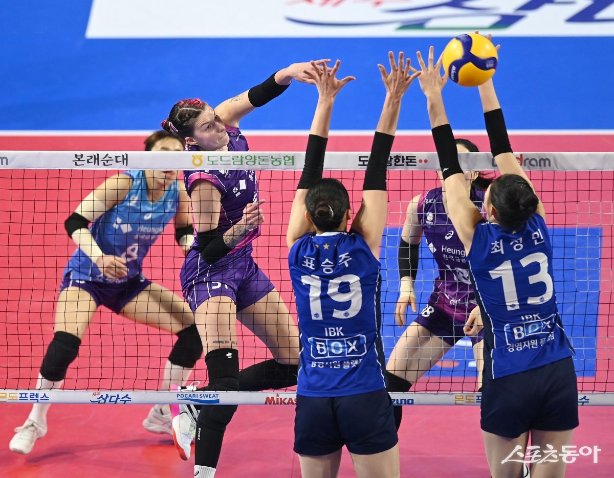 5일 화성종합경기타운 실내체육관에서 열린 ‘도드람 2023~2024 V리그’ 여자부 IBK기업은행과 흥국생명 경기에서 흥국생명 윌로우가 IBK기업은행의 블로킹 사이로 스파이크 공격을 하고 있다.