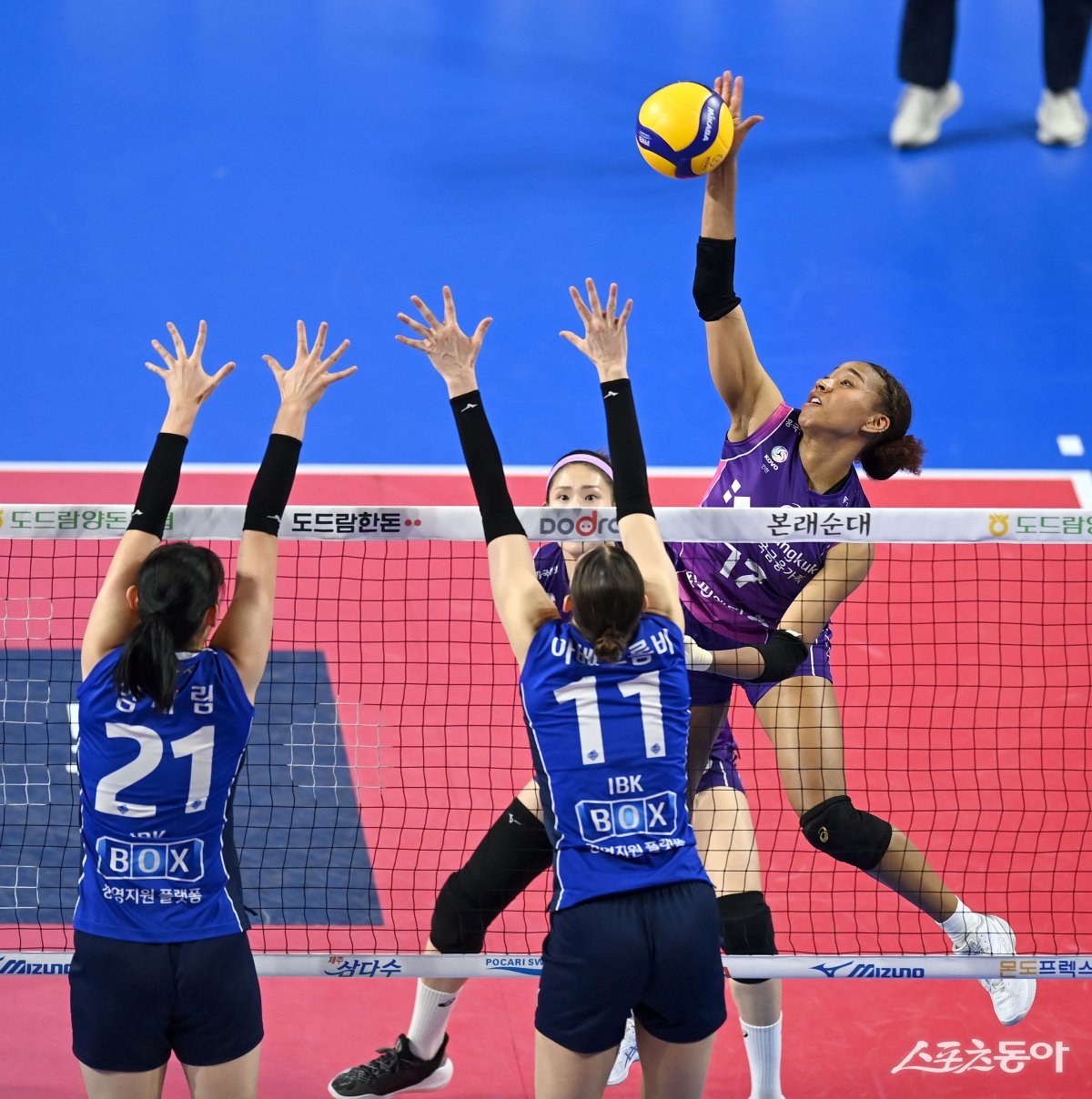 5일 화성종합경기타운 실내체육관에서 열린 ‘도드람 2023~2024 V리그’ 여자부 IBK기업은행과 흥국생명 경기에서 흥국생명 레이나가 IBK기업은행의 블로킹 사이로 스파이크 공격을 하고 있다.