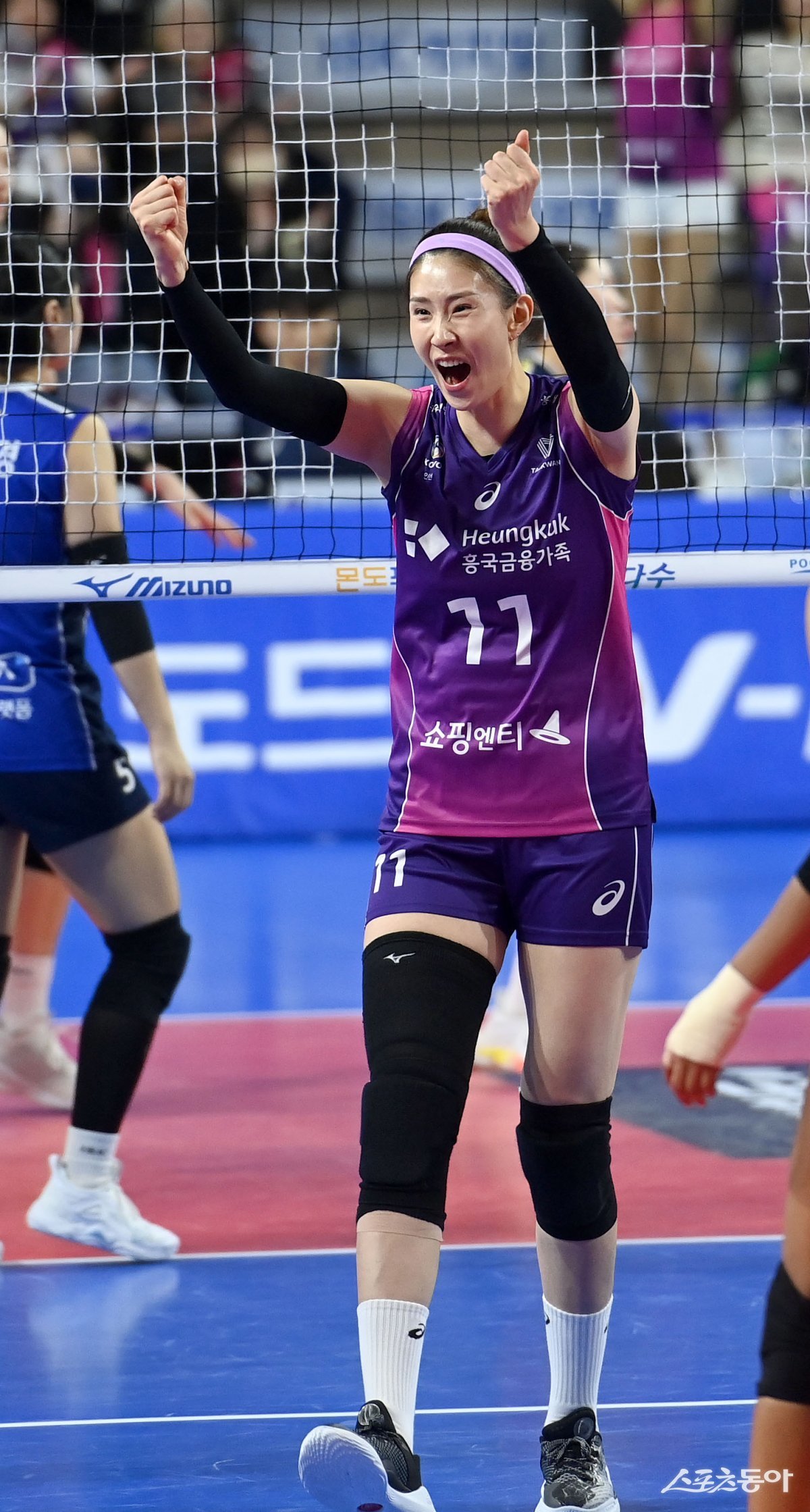 5일 화성종합경기타운 실내체육관에서 열린 ‘도드람 2023~2024 V리그’ 여자부 IBK기업은행과 흥국생명 경기에서 흥국생명 김수지가 득점에 성공한 후 기뻐하고 있다.