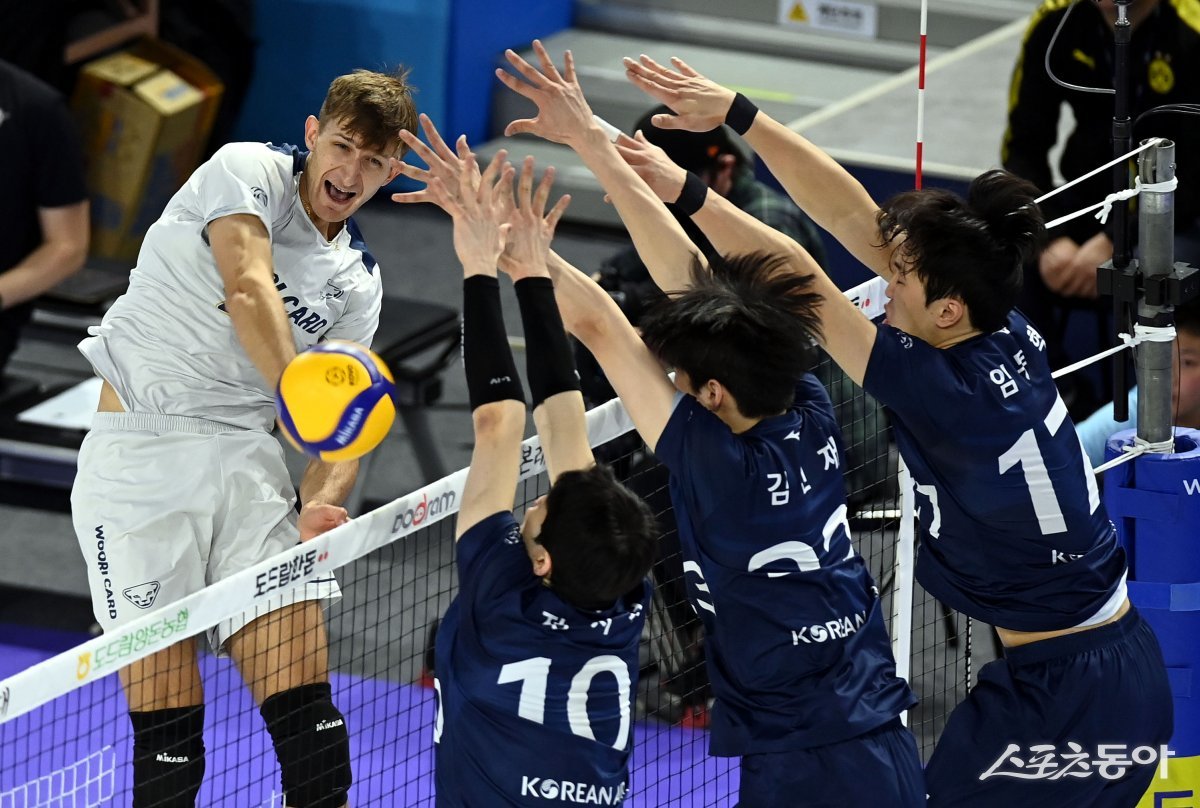 6일 인천 계양체육관에서 ‘2023-2024 도드람 V리그’ 인천 대한항공과 서울 우리카드의 남자부 경기가 열렸다. 우리카드 아르템이 대한항공 블로커를 피해 스파이크를 날리고 있다.