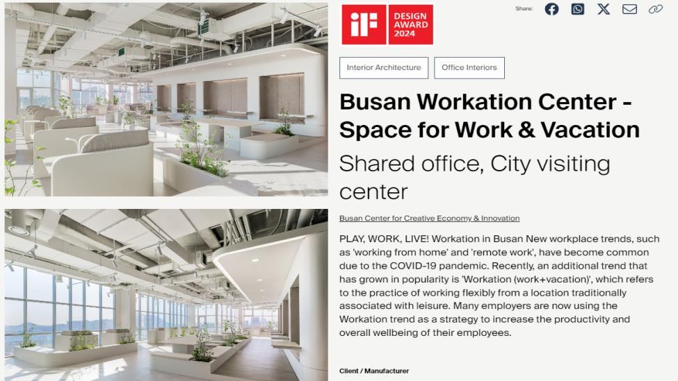 iF 인터내셔널 포럼 디자인은 “부산 워케이션 센터는 탁 트인 바다 전망과 효율적인 실내 업무공간 배치로 일의 효율성 향상은 물론 사용자들의 재충전이 가능한 공간으로 구성돼있다”라고 평가했다.