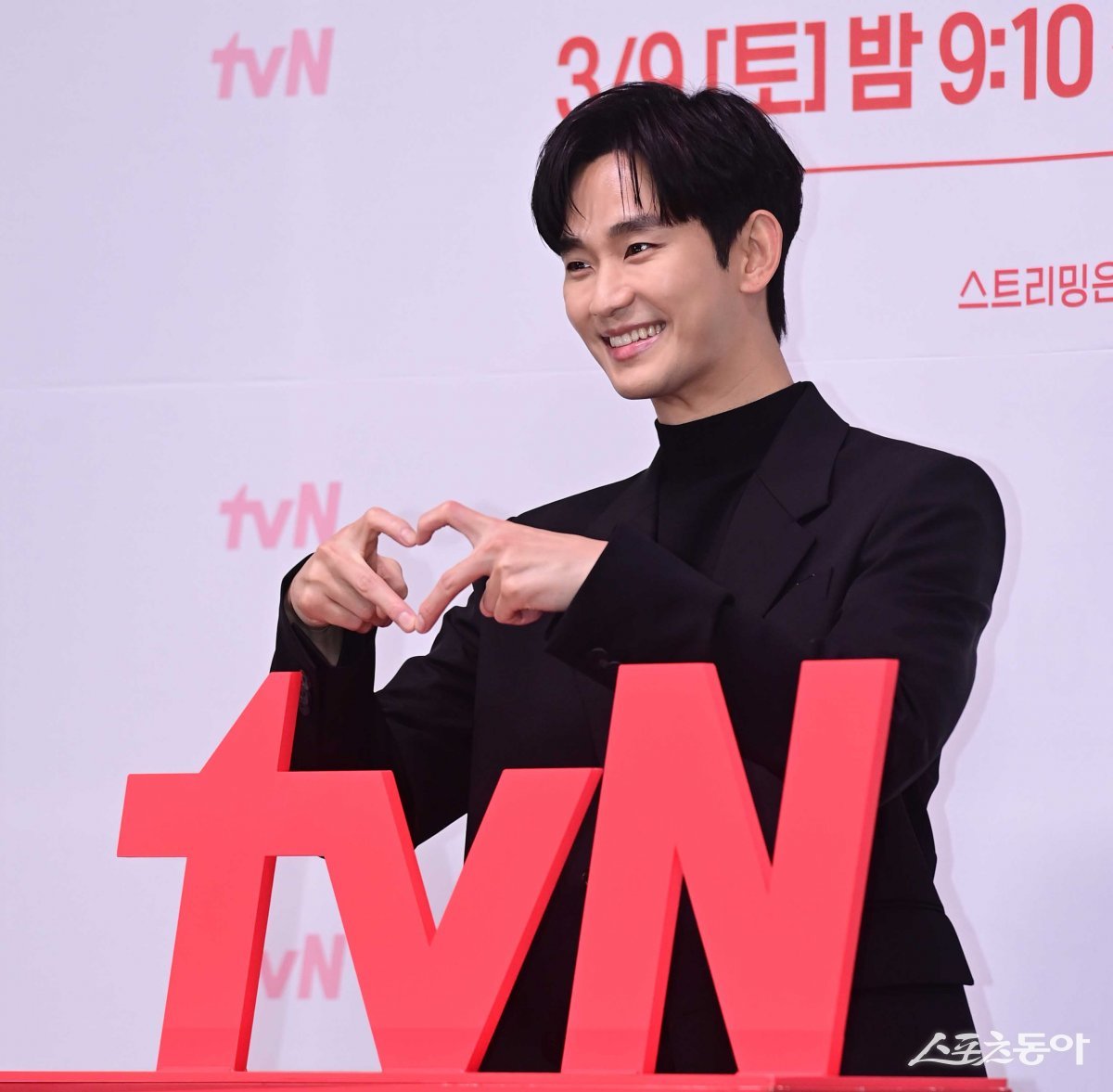 배우 김수현이 7일 서울 구로구 신도림동 라마다서울신도림호텔에서 열린 tvN 새 토일드라마 ‘눈물의 여왕’ 제작발표회에서 포즈를 취하고 있다.